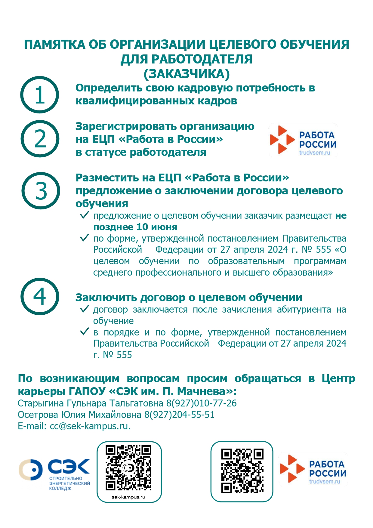 Документы 1. Заявка_для несовершеннолетних граждан 1.1. Заявка_для совершеннолетних граждан 2. Согласие_родителя к заявке, к договору 3. Согласие на обработку ПД Новая Форма ЦД 2025 Памятка_целевое для абитуриента Памятка_целевое обучающиеся Постановление Правительства РФ от 27.04.2024 N 555 О целевом обучении по образовательным программам механизм заключения целевых договоров