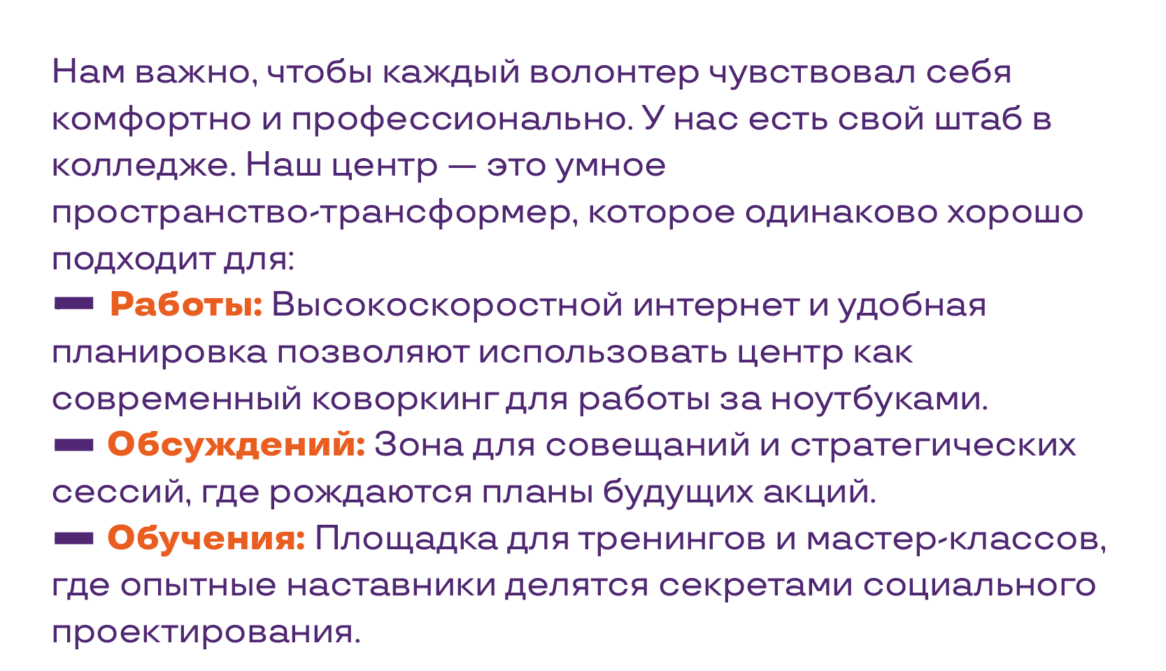 В нашем Добро.Центре есть всё необходимое: от комфортной мебели до творческой атмосферы. Мы ждем тех, кто готов тратить свою энергию на созидание и менять этот мир к лучшему.