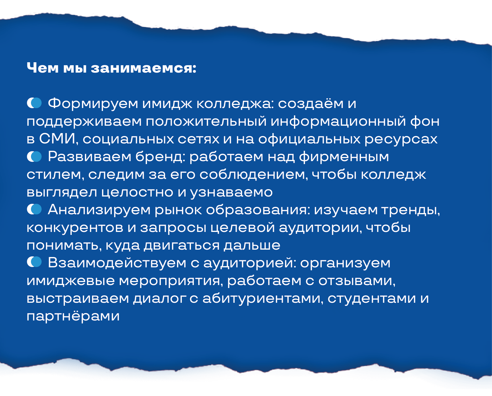 Служба маркетинга — это структурное подразделение, которое отвечает за стратегическое продвижение колледжа, управление его репутацией и развитие бренда. Мы делаем так, чтобы колледж воспринимался как современное, престижное и перспективное учебное заведение — в глазах абитуриентов, студентов, работодателей и общественности.
